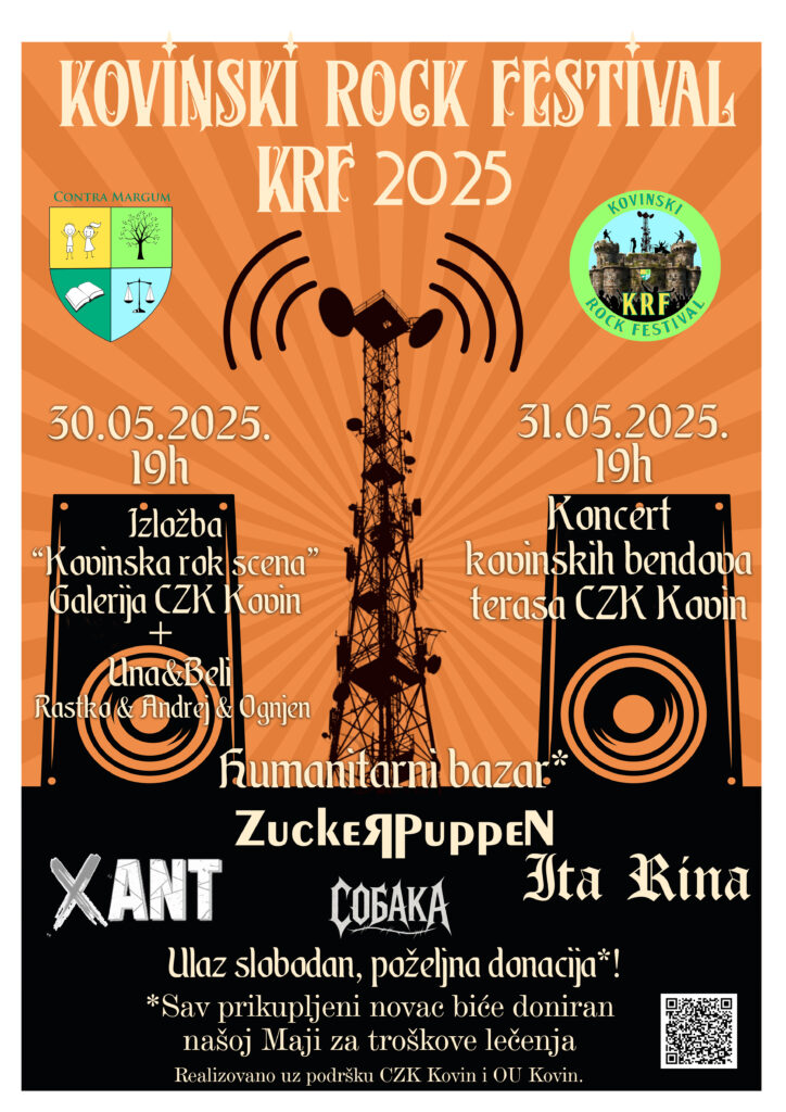 Udruženje građana “Contra Margum” Kovin organizovalo je 30 i 31. maja 2025. godine u saradnji sa Centrom za Kulturu Kovin i uz podršku OU Kovin, Kovinski Rok Festival – KRF 2025. U petak 30. maja 2025. godine u Galeriji CZK Kovin sa početkom u 19h je otvorena Izložba “Kovinska rok scena”, autorke Jovane Vujović Krivošić. Postavku ove izložbe činile su fotografije, fanzini, knjige, tekstovi, plakati i sl. kojima je prikazano koliko je raznovrsna bila rok scena u našem gradu u prethodnih više od 60 godina. Tokom trajanja izložbe muzičku podršku su pružili iskusni dvojac Una & Beli i naši mladi i veoma talentovani sugrađani Rastko, Andrej i Ognjen.